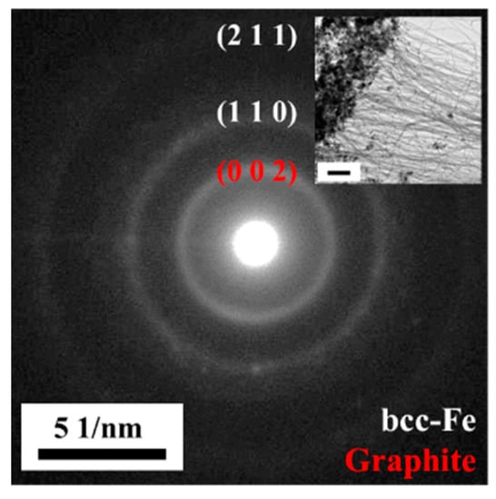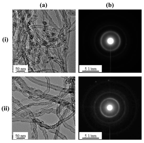 Figure 8a,b show the TEM image and the electron diffraction pattern of the CNTs for samples (i) and (ii). The tubular structure was seen for both samples, and most of the nanotubes were MWCNTs. The average number of graphene layers on the wall was calculated as 12 by assuming the interlayer distance of graphite (0.336 nm). The electron diffraction analysis shows the ring pattern attributed to the graphitic layered structure of (002) plane, which is from the side walls parallel to the direction of the electron beam [,]. The average diameters of the samples (i) and (ii) were estimated from Figure 8 as 18 ± 13 nm and 29 ± 14 nm, respectively. We concluded from this result that the diameter of the CNT was determined by the size of nanoparticles, not the chemical composition.