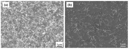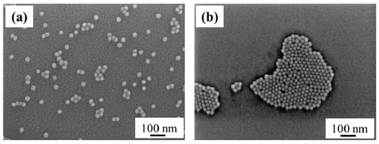 The dispersity of the nanoparticles on a substrate is very important to make dense CNTs [,]. Hence we examined the dispersity on the six kinds of substrate: SiO2/Si(100), SiO2/Si(100) with scratches, Si(100), 7° off Si(100), a molybdenum plate and Al2O3/SiO2/Si. Only the Al2O3/SiO2/Si substrate was effective to uniformly disperse the FeO nanoparticles as shown in Figure 3a. The FeO nanoparticles on a SiO2/Si substrate aggregated, forming large clusters as seen in Figure 3b. Such aggregation also occurred when using the other four substrates (not shown). The dispersity of Fe nanoparticles on the Al2O3/SiO2/Si substrate was maintained even though the substrate was heated to 650 °C. To demonstrate how the Al2O3 layer influences a final product, the PECVD was carried out for the substrates with and without the Al2O3 layer. The density of CNT synthesized with the Al2O3 layer (Figure 4a) was much higher than that without the Al2O3 (Figure 4b) because the aggregation lowered the activity of the nanoparticles. This result clearly illustrates that the Al2O3 layer is useful for suppressing the aggregation of the FeO nanoparticles and for the dense CNT growth. The suppression of the aggregation can be explained by the rough surface of the Al2O3 layer, which prevents the particles from moving on the surface. It is noteworthy that the Al2O3 does not show the catalytic function for the CNT growth because nothing formed when the Al2O3/SiO2/Si substrates without FeO nanoparticles were used. This result also indicates that only the function of graphitization is required in PECVD because no CNT grew at 650 °C and the CNT growth was observed at above 800 °C when the conventional thermal CVD was carried out.