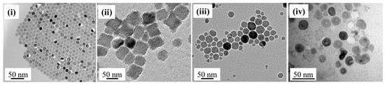 TEM images of the Fe1−xMnxO nanoparticles with different composition ratio. (i–iv) are as indicated in Table 1 that corresponds to different x in composition.