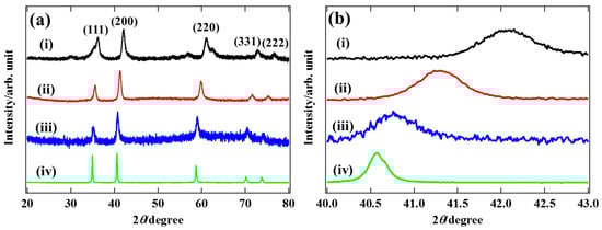 (a) XRD patterns of nanoparticles. (b) Enlarged (200) peak to show the peak shift. (i)–(iv) are as indicated in Table 1.
