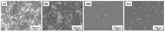 Figure 7 shows the surface morphologies of the substrates after the PECVD was carried out for all nanoparticles. The density of CNT decreased as Fe ratio decreased, then finally, nothing formed when the pristine MnO nanoparticles were used. The number density of CNT was roughly estimated from SEM images as 48 µm−2 for (i), 24 µm−2 for (ii) and 4 µm−2 for (iii). This result shows that the number of catalytic sites of graphitization decreased as the Mn ratio increased, which means that the catalytic activity of graphitization can be tuned by adjusting the composition ratio. It should be noted that the possibility of the existence of pure FeO nanoparticles in samples (ii) and (iii) is not likely considering the XRD result (Figure 6) that shows no phase separation. Samples (i) and (ii) were scrutinized by TEM and Raman spectroscopy to clarify the quality of the CNTs.