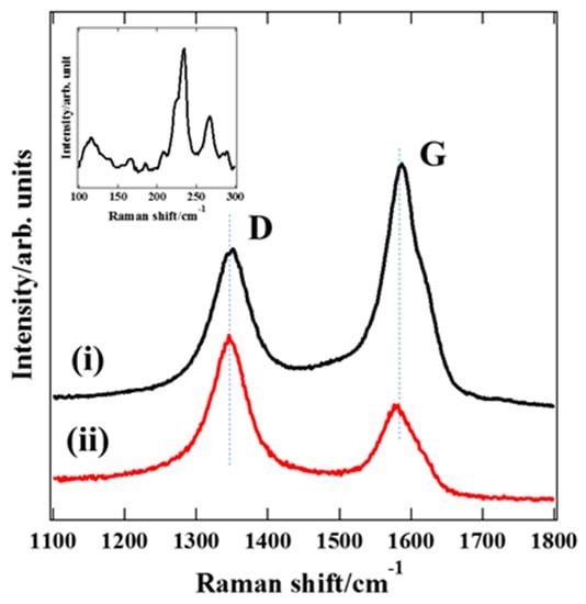 Raman spectra of the samples (i) and (ii) were also obtained to elucidate the quality of CNTs as shown in Figure 9. The quality of CNTs can be evaluated by calculating the intensity ratio of D peak (ID) and G peak (IG) because the G band is assigned to the intrinsic vibrational mode of CNT, on the other hand, the D band is assigned to the defect mode [,]. ID/IG was calculated as 0.7 for sample (i) which is comparable to the reported value (0.2–0.7) of CNT with high quality [,] while ID/IG was calculated as 1.7 for sample (ii) which is much larger than that of the sample (i). A large ID/IG of the sample (ii) indicates the inclusion of the amorphous component. Fe in Fe0.5Mn0.5O nanoparticles might not be mobile enough to make a nanotube with excellent crystallinity because the MnO is not reduced in the plasma environment and does not melt at this temperature (the melting point of the MnO is 1650 °C). Lowering the catalytic activity of graphitization due to the inclusion of the MnO caused the formation of the amorphous component. Combining this result and the fact that the number density of CNT decreased as Mn component increased, we concluded that only high catalytic activity of graphitization was required to grow CNT in PECVD because high energy plasma decomposed the source gas. Raman of radius breathing modes (RBM) was also observed for the sample (i) at the region between 150–250 cm−1 as shown in the inset of Figure 9 while no RBM was seen for sample (ii). The RBM proved that the existence of the SWCNTs with a diameter of 1–2 nm. The formation of the SWCNTs is probably because FeO nanoparticles were the smallest among four kinds of nanoparticles; hence, there was a chance to grow SWCNTs. On the other hand, SWCNT was not produced when using Fe0.5Mn0.5O nanoparticles due to the large size.