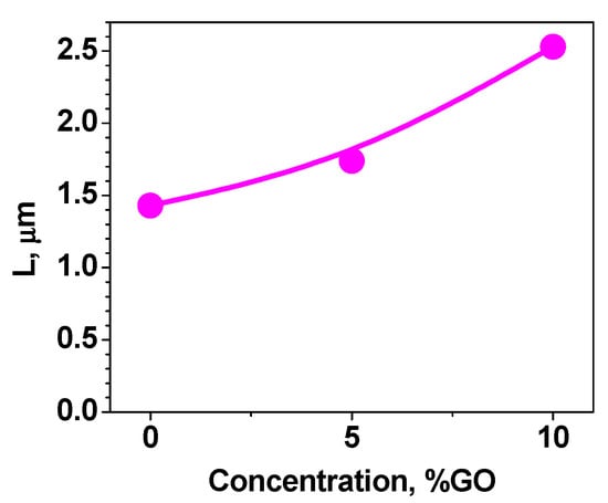Figure 8. The regions of uniform polarization within the fiber are rough and irregular. In addition, no direct correlation between the piezoelectric contrast and topographic shape is evident, which confirms that the observed effect is the intrinsic piezoelectric property of the fibers and it has not originated from electrostatic effect and/or cross-talk with topography. The influence of the concentration of the GO on the length of domain switching is shown in