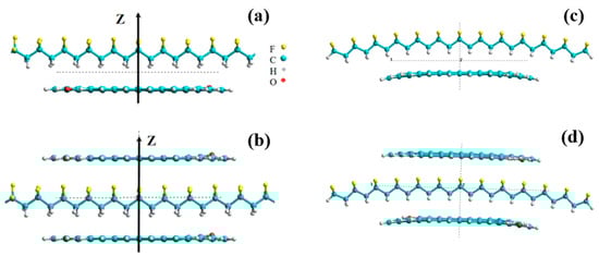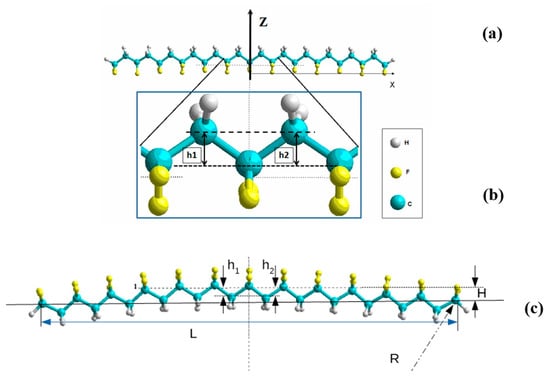 26]. Thus, the following three models were constructed and numerically investigated, viz. #1—with side H (hydrogen atoms) included in the PVDF chain and located towards the graphene oxide layer, #2—with side F (fluorine atoms) included in the PVDF chain and located towards the graphene oxide layer (both of these first options show approximately the same values of the calculated piezoelectric coefficients) and #3—graphene oxide layers on both sides surrounds the PVDF chain (sandwich-type model), as shown in