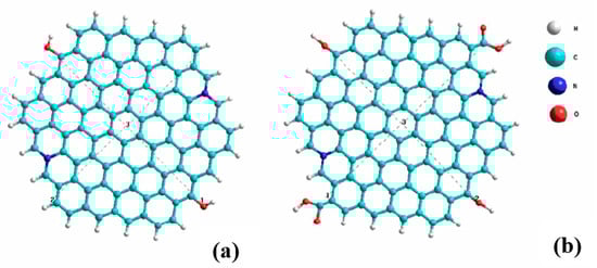 Figure 12c,d) models with one side and two sides sandwich models. It should be noted that the cluster geometry of the mentioned models is similar to the situation with graphene oxide layers the while the latter case is much more difficult in terms of calculations. The results obtained after modeling and calculations are presented below in