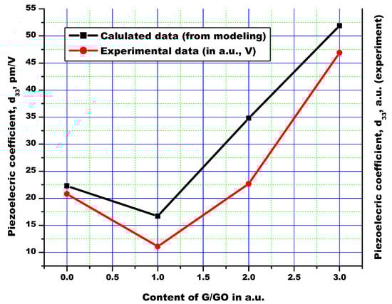 We must note that in this situation is very hard convergence of computed data for these curved models during optimization process (searching of the minimum of total energy surface for these complex molecular models using conjugate gradient methods) due their more complex structures. This work will be continued to get better accuracy of the calculations. But now we have only the case of pure Graphene layers (not the Graphene Oxide models—as it is also more complicated for optimization of curved models) and yet have some wide scatter of the data for this case. It should be noted that different types of oxidation (O, OH, COOH etc.) may notably change the functional properties of the composites and appropriate calculations becomes to be quite difficult for conventional computer modelling while these models will be considered in our further works. However, despite on used different units for values of the piezoelectric coefficient, current results clearly show the same trend of changes both for the computed and measured data (see on