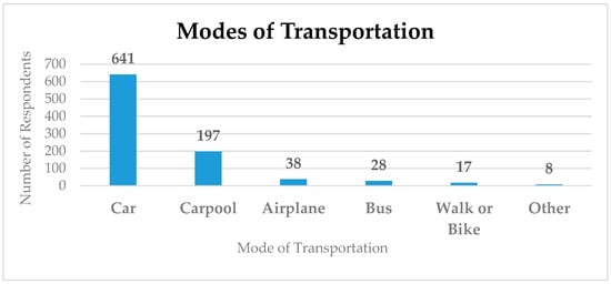 The second research objective implemented by developing six modes of transportation groups for the different types of transport utilized by the participants. Results demonstrated that 69% of the participants used their cars and traveled alone, 21.2% carpooled (e.g., used a car with one or more passengers), 4.1% traveled by airplane, 3% by bus (e.g., public transit), 1.8% walked or used their bicycles, and 0.9% indicated that they used other modes of transport without specifying the mode (see Figure 2).