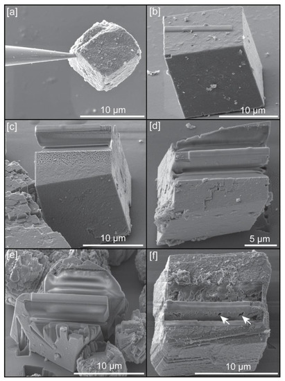 Example of sample preparation: (a) Calcite crystal lifted-out from the silicon wafer with nanomanipulator using electrostatic forces; (b) Example of Pt rectangle deposited on the (104) plane of calcite; (c) Example of wedge cut from a crystal grown with chitin hydrogel; (d) Example of wedge cut from a crystal grown with chitin at 0.12 mg/mL concentration of yatalase; (e) Example of wedge cut from a crystal grown with chitin at 1.2 mg/mL concentration of yatalase; (f) Example of crystal grown with chitin nanofibers; white arrows indicate voids in the wedge.
