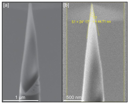 Example of tips for LEAP analysis: (a) Tip geometry after initial sharpening; (b) Tip geometry and dimensions (radius and shank angle) after final cleaning at 5 kV.