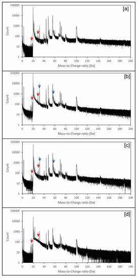 Example of representative APT mass spectra: (a) Calcite and chitin hydrogel; (b) Calcite and chitin at 0.12 mg/mL concentration of yatalase; (c) Calcite and chitin at 1.2 mg/mL concentration of yatalase; (d) Calcite and chitin nanofibers (Note: Red and blue arrows indicate some representative peaks indicative of chitin and yatalase, respectively; more details in Table 2). Detailed mass spectra with high resolution of peaks, identified in Table 2, can be found in Supplementary Figures S1–S4.