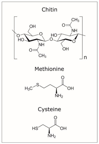 For the efficient use of APT to detect organics occluded in calcite crystals, it is essential to understand the bonding of organic macromolecules and the weakness points for potential “breakage” during field evaporation. Chitin has a relatively simple configuration (Figure 5), yet the use of yatalase for the degradation of chitin to facilitate occlusion in calcite complicates the understanding of mass spectra (Figure 4). Yatalase also can contain sulphur from both methionine and cysteine (Figure 5). This is particularly important to detect the presence of sulphur associate to organics and then linked to the yatalase. The challenge is associated to the interpretation of the contribution of oxygen and sulphur to peak at mass 32 (Figure 4 and Table 2 and Tables S1–S4); in the analysis of pure calcite, the peak at mass 32 has been previously interpreted as O2 [11]. However, the new version of the IVAS software for the analysis of APT data allows decomposing the contribution of different ions/molecules to a single peak, if sufficient auxiliary peaks (i.e., isotopes) are present, and the comparison of these values to those of the bulk chemistry without decomposition (Table S1). Therefore, the amount of detected total sulphur is less than 0.1 atomic % with the lowest concentration of yatalase (0.12 mg/mL−1), meanwhile increases to ~0.13 atomic % in those crystals grown with yatalase at a concentration of 1.2 mg/mL−1. The possibility of discerning the amount of sulphur associated to organics using APT is of importance for the future analysis of biogenic biominerals, as most biogenic carbonates contain inter- and intra-crystalline organics enriched in sulphated polysaccharides [15].