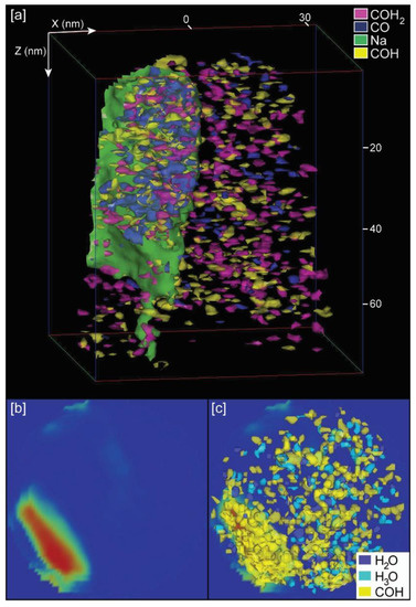 Independently of providing bulk chemistry data of samples, a unique and powerful characteristic of APT is the possibility of a 3D reconstruction of the distribution of chemical components. This allows the 3D visualization of organic components inside the calcite crystals. For calcite samples grown with chitin, either with or without yatalase degradation, we selected the peaks corresponding to chitin (COH– and COH2−) with the highest abundance, based on the chemical spectra (Figure 4), for the 3D mapping of the chitin distribution (Figure 6 and Figure S5 in Supplementary Materials). Chitin fragments are distributed within the calcite crystal forming discrete clusters (2 to 5 nm) that are more abundant with higher concentration of yatalase at 1.2 mg/mL (Figure 6c,d). Within these clusters, water and hydronium molecules are found in association, potentially reflecting the original hydration of organic components and posterior dissociation after field evaporation during LEAP analyses. In the case of the calcite crystal grown in the presence of chitin nanofibers, chitin is also present in discrete clusters of high abundance within the crystal (Figure 7). However, clusters coalesce and form a linear feature (along Z axis) in association with a higher concentration of Na. This could be related to a specific nucleation mechanism of carbonates with organics in the presence of sodium [16]. However, we do not have conclusive data about the potential role of sodium as sufficient concentration for a partial 3D reconstruction was only found in one tip. Overall, the 3D reconstructions show that chitin occluded with calcite formed a discrete clustering similar to intra-crystalline organics in prisms of Atrina pectinata, whereas for chitin nanofibers in presence of sodium linear structures could be formed similarly to organics in prims of Pinctada fucata [17].