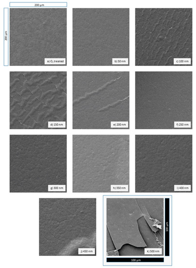 Figure 1 shows representative SEM images for the different thicknesses of a-C:H layers on oxygen treated PHB samples. All images with increasing thickness starting with the O2 plasma treated one in Figure 1a display a sample section of 200 µm × 200 µm, except for the 500 nm deposition in Figure 1k (it is a 100 µm × 100 µm detail).