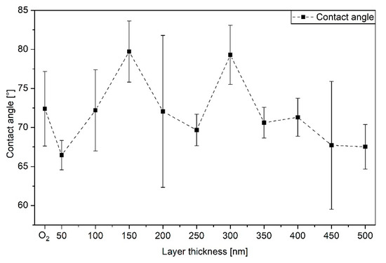 Figure 2 shows the contact angles obtained for the series of a-C:H layers of different thicknesses deposited on PHB. Additionally, the O2 plasma cleaned PHB sample is shown which was used as a reference. The contact angle range obtained is between 65° and 80°. At 50 nm a-C:H, the lowest value of 66.5° is found, indicating a more sp3 like hybridization of the carbon atoms. Furthermore, it shows a reduced content of oxygen-groups compared to the O2 plasma activated sample. With increasing layer thickness, the contact angle increases until it reaches a maximum of 79.7° at 150 nm. Since the overall deposition process compared to the 50 nm sample has not been changed except for a longer coating time to get thicker layers, the hybridization states have to change with increasing layer thickness; the proportion of sp2-hybridized carbon atoms increases. The contact angle measures also indicate surface roughening because of increasing error bars. At a layer thickness of 200 nm, the contact angle drops rapidly down to 72.1°, accompanied by a large error. Here, the a-C:H layer was broken up, presumably due to stress within the layer (see also Figure 1e, SEM section). As the a-C:H thickness increases to 250 nm the contact angle value decreases slightly. At a carbon thickness of 300 nm the value rises up again to 79.3°. Further along, the contact angles decrease again and remain nearly constant with a slight decrease of the higher layers.