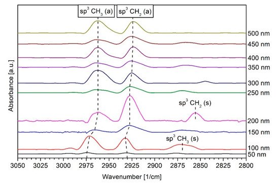 With an a-C:H layer thickness of 200 nm, the sp3 CH3 (a) peak is again more pronounced. On the other hand, a peak appears at 2855 cm−1, assigned to the sp3 CH2 (s) binding [42,44,45,46]. The sp3 CH2 (a) peak at 2927 cm−1 rises stronger and becomes the dominant one in the spectra. With 250 nm the spectrum changes again and is similar to the previous one for 150 nm. The sp3 CH2 (s) peak disappears and the sp3 CH3 (a) one decreases again. Additionally, the sp3 CH3 (s) peak at 2870 cm−1 appears again. The peak dominance is reversed by increasing the layer thickness to 300 nm a-C:H. The right flank, which has formed due to the superposition with the sp2 CH2 (s) peak, is now falling more strongly, which is due to the fact that the sp2 oscillation becomes weaker. At a layer thickness of 350 nm the spectrum is similar to 150 nm and 250 nm. With 400 nm of layer thickness, only two peaks are visible. Both the sp3 CH3 (a) peak at 2962 cm−1, still overlaid with the sp2 CH2 (s) at 2950 cm−1 but nearly gone, and the sp3 CH2 (a) at 2924 cm−1, are almost balanced. The spectrum for the 450 nm deposition is similar again to the ones of 150, 250 and 350 nm. The 500 nm spectrum corresponds to the spectrum for 400 nm layer thickness.