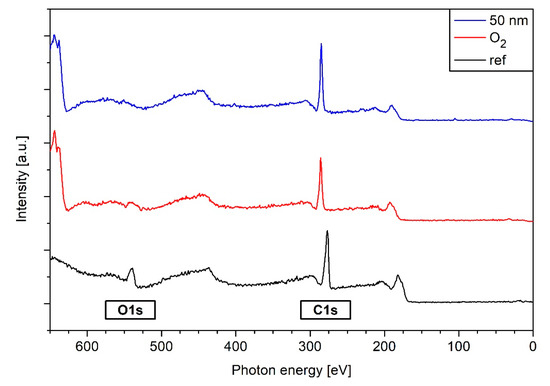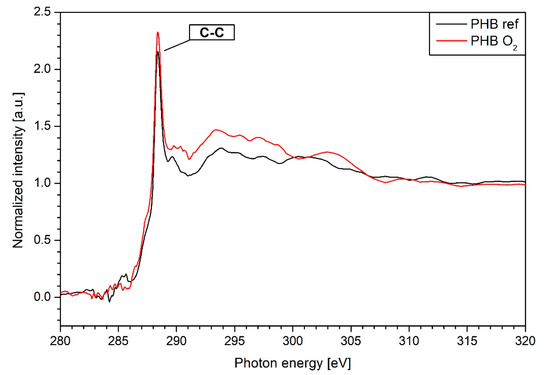 In Figure 4 the NEXAFS spectra for raw PHB and an O2 plasma treated one are shown. The spectra were processed as described in the experimental details. Both spectra do not differ significantly, except for a slightly higher intensity in the sample treated with O2 and small variations in the fingerprint region. The fact that O2 plasma—at least with respect to carbon bonds—has no changing properties, means it only serves herein to clean the sample surface of impurities. Based on the chemical structure of PHB, the dominant peak is the C–C bond.