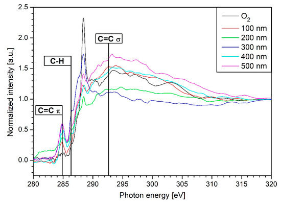 The obtained NEXAFS spectra for the series of a-C:H layers with various thickness (here: 100, 200, 300, 400 and 500 nm) are displayed in Figure 5. The peak positions have been determined to C=C π (284.85 eV), C002DH (286.15 eV), C–C (288.35 eV) and C=C σ (292.55 eV) [47,48,49,50,51]. The dominant binding resulting from NEXAFS studies is the C=C π binding at an energy of ~284.8 eV. For further analysis, all peaks for different binding states are normalized to the C=C π peak and its ratio to the other peaks is analyzed. The ratio of C=C σ to C=C π bonds remains almost constant at all time. There is a deviation from this factor at a layer thickness of 100 nm. Here, both the value of the ratio of C–C to C=C π and of C=C σ to C=C π make a jump, which can be attributed to a decrease in the proportion of C=C π. The ratio is here nearly 1:1 each. The ratio of the C–H to C=C π is almost constant over the entire variation of the a-C:H layer thickness.