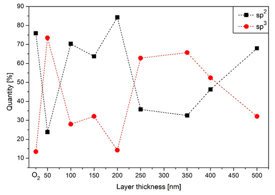 XPS was applied for supporting analysis and for quantitative determination of different sp-bonding states. First, a survey spectrum over the full width of 0–700 eV was recorded for an overview of the elemental surface composition. For a more detailed analysis, both the O1s and the C1s peaks were recorded. The C1s peak was measured twice at different points to ensure homogeneity of the sample and measurement accuracy. The total C1s peak was analyzed with the commercial software CasaXPS to provide the proportions of sp2, sp3 and C–O bonds. Using Origin software, the results were presented according to the layer thickness.