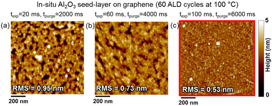 This approach provides the initial physical adsorption, by the van der Waals interactions, of H2O molecules on the Gr surface. The physisorbed H2O molecules behave as activation sites for a low-temperature deposited Al2O3, which in turn acts as seed layer of nucleation for a subsequent standard ALD process. In order to ensure uniform physisorption of the H2O molecules on the Gr surface, it is necessary to operate within an adequate temperature window [46], i.e., not too low to avoid the water condensation and not too high to prevent the escape of molecules. As an example, for the Al2O3 seed layer, obtained by using TMA and H2O precursors, the optimal temperature window is 100–130 °C [46]. Besides the deposition temperature, other key parameters (such as the precursor’s exposure and purging times) need to be optimized to achieve uniform coverage of Gr with the seed-layer. Figure 1 shows the optimization study (carried out by atomic force microscopy, AFM, measurements) of the deposition conditions for a 3–4 nm Al2O3 seed-layer on the surface of CVD-grown Gr transferred onto a Al2O3−Si substrate [41]. For a fixed number of ALD cycles (60) at a deposition temperature of 100 °C, optimal coverage was achieved using 100 ms exposure time to H2O and TMA precursors, and 6000 ms purging time.