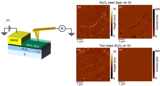 The electrical uniformity of the seed-layer and of the two-step Al2O3 film was also investigated by conductive atomic force microscopy (C-AFM) [41]. The C-AFM experimental setup for nanoscale resolution mapping of the current through the dielectric layer is illustrated in Figure 3a, whereas the morphology and current maps for the seed-layer and the two-step Al2O3 on Gr are reported in Figure 3b–e. Although the Al2O3 seed layer is characterized by a continuous morphology, it shows a conductive behavior in the Gr wrinkle regions due to the insufficient structural quality related to the low growth temperature. However, excellent electrical uniformity with negligible leakage current is observed in the case of the final Al2O3 deposited by the two steps.