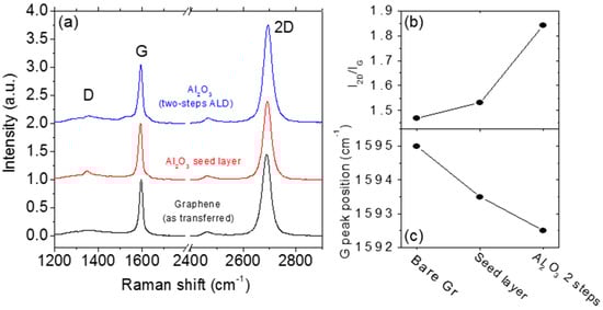 (a) Raman spectra of as-transferred Gr (black), after the Al2O3 seed-layer deposition at 100 °C (red) and after the two-step ALD deposition (blue). Behavior of the 2D over G peak intensity ratio I2D/IG (b) and of the G peak position (c) on the three different samples. Images adapted with permission from [41]. Copyright of American Chemical Society, 2017.