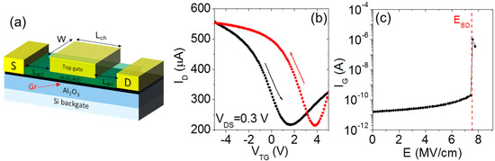 The electrical characterization of top-gated Gr field effect transistors with the 22 nm Al2O3 top gate dielectric (see schematic in Figure 5a) allowed to evaluate the dielectric properties (breakdown dielectric field, permittivity) of the Al2O3 film on Gr, as well as the interface trap density at Al2O3/Gr interface and the Gr carrier mobility [41]. A relative dielectric permittivity (ε = 7.45) was first evaluated from capacitance-voltage measurements between the top-gate and source electrodes. Figure 5b shows the gate leakage current IG as a function of the electric field across the gate oxide, from which a breakdown field EBD = 7.4 MV/cm was estimated for the Al2O3 insulator on Gr. Finally, Figure 5c shows the transistor’s transfer characteristics (ID–VTG at a drain bias VDS = 0.3 V) measured under forward and backward sweep of VTG. A Gr field effect mobility of ~1200 cm2 V−1s−1 was obtained from these electrical characteristics, after excluding the effects of the contacts and access resistances [41]. The hysteresis between the two curves in Figure 5c was ascribed to electron trapping by traps located at Gr/Al2O3 interface and in the Al2O3 near-interface region. A total traps density of 4 × 1012 cm−2 was estimated from the relative shit of the current minima. The interface traps can be related, in part, to residual polymeric contaminations from the polymethylmethacrylate (PMMA) aided Gr transfer [15]. On the other hand, the near-interface traps can be due to the lower structural quality of the interfacial Al2O3 seed-layer deposited at low temperature (100 °C).
