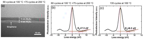 As an example, Zheng et al. [37] performed cross-sectional TEM analyses (see Figure 6a) for direct imaging of the lower density of a 4 nm Al2O3 seed layer (deposited by 60 ALD cycles at 100 °C) with respect to the upper 5 nm Al2O3 layer (deposited by 75 ALD cycles at 200 °C). An energy bandgap Eg = 7.3 eV was evaluated from XPS energy loss measurements performed on the two steps deposited Al2O3 (see Figure 6b), whereas a significantly smaller bandgap (Eg = 6.3 eV) was obtained for a reference Al2O3 film deposited with only one step by 135 cycles at 100 °C (see Figure 6c).