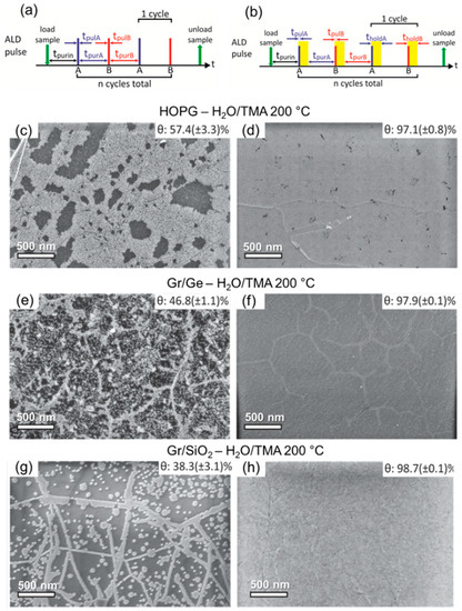 Great attention has been paid towards the possible approaches to enhance the direct ALD deposition of high-k dielectrics on the Gr surface. Some reports demonstrated that the uniformity of the dielectric nucleation is heavily dependent on the ALD deposition parameters, mainly the residence time of the precursors and the temperature. As an example, Aria et al. [42] have shown that, by optimizing the pulse length and using a conveniently long precursor residence time, sub-2-nm thin homogeneous aluminum oxide (AlOx) layers can be obtained, without intermediate steps of functionalization and seeding, at a deposition temperature of 200 °C and on different substrates (Gr/Cu, HOPG, Gr/Ge, Gr/SiO2). Figure 7a,b illustrates two different ALD processes adopted by the authors [42]. In the first process (the typically employed one), the H2O and TMA were dosed alternatingly into the reaction chamber by separated pulses and purging periods. In the second process (Figure 7b), a H2O/TMA soaking period was introduced by stopping the flow to create a static atmosphere in the process chamber for several seconds (thold) right after the H2O/TMA was dosed. Before the subsequent pulse, the flow was continued, and the chamber was purged. The results of the AlOx growth on different graphitic substrates using the two process modes are illustrated in Figure 7, showing a relatively low surface coverage of ~57% on HOPG (Figure 7c), ~47% on Gr/Ge (Figure 7e), and ~38% on Gr/SiO2 (Figure 7g) using the first mode, and >97% coverage ((Figure 7d), (Figure 7f) and (Figure 7h)) using the second one.