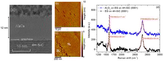 Figure 10a shows a high resolution cross-sectional TEM image of the deposited Al2O3 film (with ~12 nm thickness), characterized by an amorphous structure and uniform contrast on all thickness, indicating a uniform density. Figure 10b shows a large scale (20 μm × 20 μm) AFM image of the deposited Al2O3 film, showing a uniform and conformal coverage, with small depressions corresponding to bilayer Gr areas. These features of the Al2O3 morphology are further elucidated in Figure 10c, where the boundary region between the 2L and 1L areas is reported. Raman spectroscopy measurements on EG before and after the Al2O3 deposition (see Figure 10d) indicated that the ALD process does not significantly affect the doping and strain of the EG. For comparison, the same ALD process was also performed on monolayer Gr transferred on on-axis SiC, showing an inhomogeneous nucleation and 3D Al2O3 islands growth, similarly to the case of monolayer Gr on other substrates, like SiO2. These results indicated that the uniformity of the ALD deposition of Al2O3 on the monolayer EG is not related to the SiC substrate itself, but to the peculiar properties of the interface between the EG and SiC, i.e., the presence of the buffer layer, responsible for a high n-type doping and strain of EG. An enhanced chemical reactivity of Gr subjected to significant mechanical strain or doping has been reported by several authors [63,64]. In particular, ab-initio DFT calculations showed an enhanced adsorption energy for water molecules (working as co-reactant in the thermal ALD process) on highly n-type doped monolayer Gr, indicating the doping of EG induced by the underlying buffer layer as the origin of the excellent Al2O3 nucleation [44].