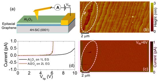 The electrical quality of the Al2O3 film on EG was also evaluated by nanoscale resolution current maps and local I–V analyses based on C-AFM [65], as illustrated in Figure 11a.