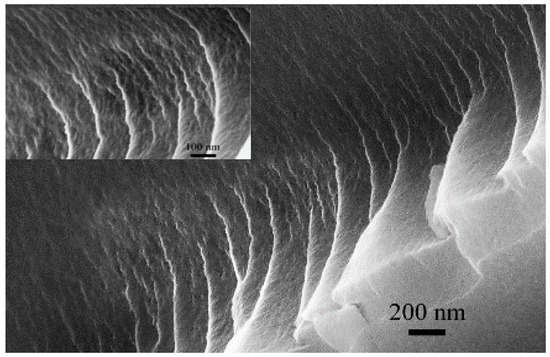 SEM images of the cleavage surface of solid aminocumulene (AC) with different magnifications.