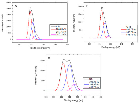 (A) C 1s, (B) O 1s, and (C) N 1s X-ray photoelectronic spectroscopy (XPS) fitted spectra obtained from the surface analysis of solid AC.