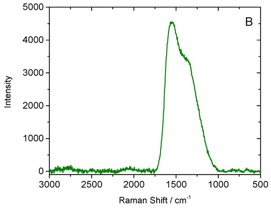 Figure 3B shows the Raman spectrum of AC. Two intense overlapping peaks are observed at 1370 and 1570 cm−1, which are characteristic of the low-ordered forms of carbon (usually denoted by D and G bands, respectively. The broad band featured at 2800 cm−1 can be attributed to vibrations of N–H bonds. It is impossible to compare our Raman spectrum to data reported in the literature for various carbyne forms, i.e., polycumulenes and polyynes, because of the very large scattering of literature data, even for the same type of compounds. Hence, the strong influence of substituents on the position and especially the intensity of the bands in the Raman spectrum should be also taken into account.
