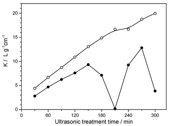 Effective light absorption coefficient (K, at 500 nm) versus insonation time for graphite exfoliation in 30.0 g/L of aqueous acetic acid solution containing 5.0 g/L of AC (open circles), and, 10.0 g/L of OP-7 aqueous solution (filling circles). Graphite concentration equals 10.0 g/L.