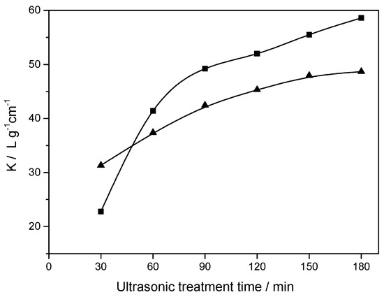 Effective light absorption coefficient (K, at 500 nm) vs. insonation time for expanded graphite exfoliation: in 5.0 g/L of AC plus 30.0 g/L of acetic acid aqueous solution (squares) and 4.0 g/L of Triton X-100 aqueous solution (triangles). Graphite concentration equals 2.0 g/L.