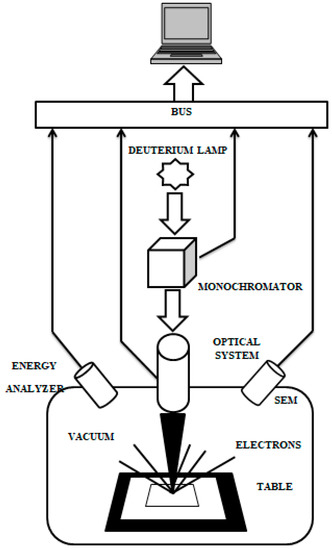 The ASED electron spectrometer (Figure 1, Ekaterinburg, Russia) made it possible to measure the electron emission spectral response in the temperature interval of 20–400 °C. Contrary to stationary external photoelectron emission and internal photoinjection currents over interface barriers, the OSEE is a nonstationary photoelectron emission from localized surface-near electronic states into vacuum [9]. The spectra obtained in our experiments were normalized against the source light flux. The spectral position error for described setup was less than 0.03 eV while the intensity error did not exceed 5%. Additional error caused by OSEE nonstationarity, which was lower than registered background intensity and two–three orders below than measured signal. The obtained nonselective spectral dependences were processed using original “OSEE-fitter” software [10], implementing the models described below.