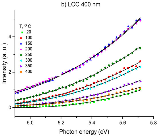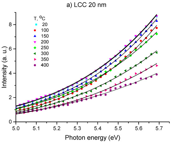 The parameters of OSEE curves fitted by Equation (1) are shown in Table 1. The n factor values were found between 2 and 3, showing that the electron emission was related to both direct and indirect optical transitions. Considering a significant error in parameter determination, all this experimental data may be matched to model values. Thin films of linear-chain carbon exhibited a stable value of n around 2.7 over the entire temperature range. This implies that the electron emission was mainly due to the indirect transitions between surface energy states with the participation of phonon processes. From Table 1, the value of Φ varies from 4.0 to 4.5 eV for samples of films with a thickness of 400 nm, while the value is less by 0.1–0.2 eV for films with a thickness of 20 nm.