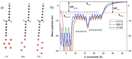 In order to discover the reasons of the work function change in the samples under study, we performed the DFT calculation of the electric potential along the axis perpendicular to the substrate. Surface slabs of copper crystal cut by (001), (110), and (111) planes were covered by a layer of carbon chains (Figure 3a).