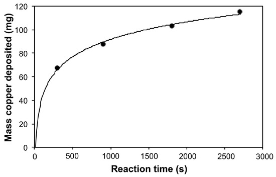Figure 1 shows the mass of content increases with time. The mass of copper deposited increases at an exponential rate. Electroless deposition is ordinarily an autocatalyzed process [34]; however, this would be expected to result in a constant reaction rate, until Cu2+ depletion in the bath occurs. Reactions of this type have the property that the rate equations are nonlinear; that is, the reaction is very slow in the beginning, but steadily increases as more product is formed. However, as is clear from Figure 1, this is not the case, since there is clearly no induction period. We note that the deposition does not follow either first- or second-order rate reaction kinetics. It has been observed that the electroless deposition of Cu onto CNTs is facilitated by the surface functionality of the CNTs [12,15]. This can be associated with the inherent oxygen species present during the synthesis and purification of the CNTs [12], or due to the attachment of specific functional groups that lower the reduction potential of Cu2+ upon coordination [15,25]. At long deposition times, stagnation in the mass of copper deposited could likely also be due to the depletion of copper ions from the plating bath.