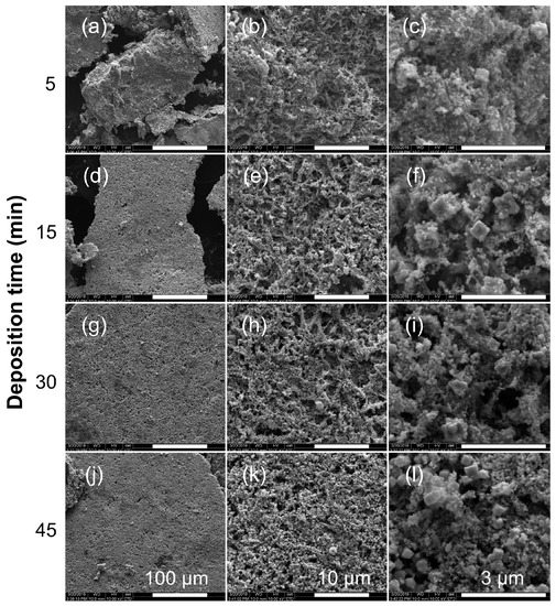Representative SEM images of electroless Cu-SWCNT composites deposited (at a bath temperature of ~90 °C) at different reaction times with resulting SWCNT composition: (a–c) 5 min, 10.6 wt.% SWCNTs; (d–f) 15 min, 8.33 wt.% SWCNTs; (g–i) 30 min, 7.2 wt.% SWCNTs; (j–l) 45 min, 6.5 wt.% SWCNTs. Scale bar = 100 μm (a, d, g, j), 10 μm (b, e, h, k), and 3 μm (c, f, i, l).