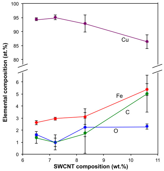 The presence of oxygen could be due to native oxide layers on the copper formed by self-passivation, along with oxygen-containing defect groups on nanotube surfaces [37]. It is also likely that copper oxides may have formed. Prior researchers have reported on the electroless deposition of copper oxides on CNTs [38]. It is interesting to note, however, that the oxygen content does not appear to alter dramatically with SWCNT content (Table 3 and Figure 4). This is in agreement with our observation for the electrodeposition of Cu on SWCNTs, in which there was initially a drastic drop in oxygen content upon the addition of the CNTs, but no variation in oxygen content was subsequently observed between the composites containing varying concentrations of CNTs [23]. This phenomenon is likely due to a reduction in the oxidation of copper due to the presence of the SWCNTS, coupled with enhanced corrosion potential, reduction of copper, and/or passivation of copper, as was summarized from trends in prior literature [23].