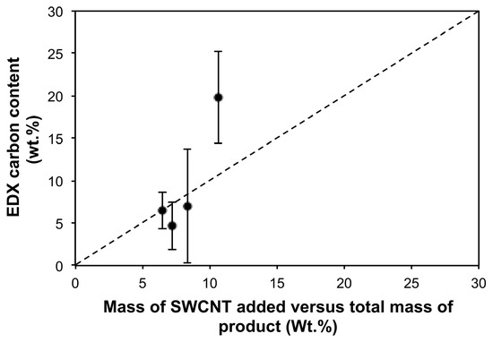 Carbon content (wt.%) as determined by EDX as a function of the calculated ideal values of SWCNTs (wt.%) based on the mass of SWCNT added to the electroless reaction mixtures, as a function of the final mass of the air-dried products from the reactions. The dashed line represents an ideal relationship assuming both a homogeneous material and that all the SWCNTs are incorporated into the composite.