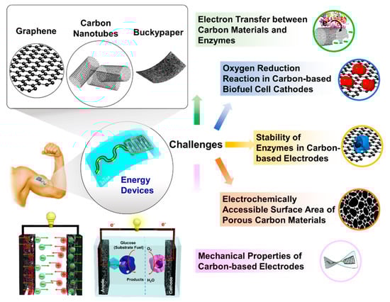 Although many researchers have devoted more effort toward the development of personalized energy devices, there are still a number of challenges that need to be dealt with. Single and multi-walled CNTs, graphene, buckypaper, and other such carbon materials are of specific interest for implementation in personalized energy applications. However, as discussed in our article, limitations such as establishing efficient electron communication between carbon and enzyme, oxygen reduction optimization, enhancing enzyme stability, finding the ideal carbon material surface area, and tuning mechanical properties have continued to be major challenges in this field.