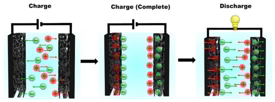 Carbon electrode materials serve as major contributors toward the performance of the supercapacitor. Carbon materials, such as activated carbon, carbon aerogels, CNTs, and graphene help exhibit the electric double-layer capacitors (EDLC) [,,]. In general, these carbon-based materials alone are electrochemically inert, and the energy storage only takes place due to the accumulation of the charges/ions on the electrode surface. The carbon or composite material-coated electrodes can act as active materials and/or collectors. In principle, as shown in Figure 2, carbon-based supercapacitors contain an electrical double layer formed at each carbon interface where the carbon material is in contact with the electrolyte. When the supercapacitor is charging, the negative ions and vacancies on the cathode, and the positive ions and the electrons on the anode are arranged across the interface. This arrangement of ions and electrons (vacancies) during the charged state is known as an “electrical double layer”. Since the layer is composed of multiple ions moving, there is no major chemical reaction involved such as in conventional batteries. This yields a superior charge-discharge life cycle. Porous carbon is used on the electrode to increase its surface area []. The greater the surface area, the greater the charge that can be stored; therefore, the supercapacitor with highly porous carbon nanomaterials is able to reach a higher capacitance. More comprehensive reviews, including an overview of electrochemical performances in energy-related applications of carbon-based materials, can be found further in earlier publications [,,,,].