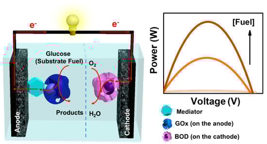In a conventional BFC, such as a glucose/oxygen BFC (Figure 4), a glucose metabolite serves as a fuel which is oxidized with the assistance of the biocatalyst immobilized at the bioanode to release electrons. The charge then flows into a current collector, such as the conductive carbon material-based electrode. Subsequently, these generated electrons are moved to the cathode. This cathode is the electrode where reduction (i.e., the acceptance of those generated electrons) takes place. O2 is a typical fuel on the cathode because of its natural availability and high O2/H2O redox potential.