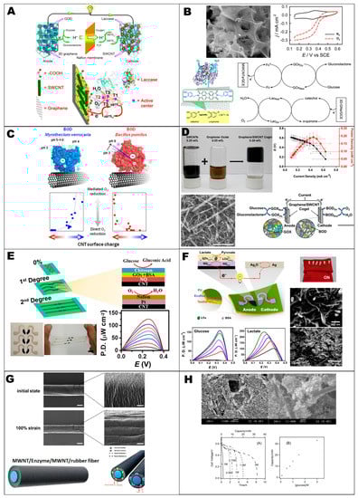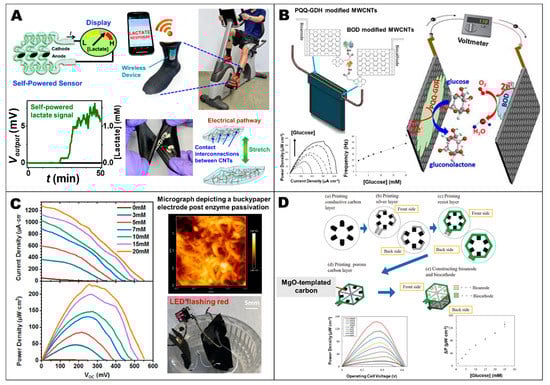 Another example is shown in Figure 7C, describing further efforts toward developing a fully-flexible, self-powered system capable of indicating the presence of glucose []. The system takes advantage of the combination of two flexible electronic technologies. The first is the flexible self-powering BFC, while the second is a flexible electronic device; in this case, a circuit-board decal made from biocompatible microbial nanocellulose. One critical advancement in this field is the advent of aggregated multi-walled carbon nanotubes (MWCNTs) known as buckypaper. Buckypaper has been functionalized to be used as the underlying support when fabricating BFCs including compliant electrodes [,]. Within CNT papers, redox molecules are embedded as the electrical wiring for the enzymes. This BFC is composed of MWCNT sheets functionalized with a heterobifuntional crosslinker known as 1-pyrenebutanoic succinimidyl ester, resulting in π–π stacking of the pyrene moieties along the MWCNT walls. These materials form a peptide bond with the lysine group of the enzyme, which crosslinks the MWCNTs with the biocatalyst. The anode of the BFC was comprised of pyrroloquinone quinone glucose dehydrogenase (PQQ-GDH) covalently attached to 1-pyrenebutanoic succinimidyl ester modified MWCNTs to aid in glucose oxidation. The cathode incorporated BOD in order to catalyze the ORR reaction. Additionally, the physical texture of the buckypaper allowed a high volume of the analyte sample to be wicked into the bioelectrodes due to its porosity. The analyte sample is retained in the bioelectrodes for a long duration in order to facilitate stable power production for powering small electronic devices connected to the body. The enzymatic glucose BFC was able to function as a glucose sensor and a light-emitting diode (LED) indicator. The supplementary functions of the device did not require additional electronic equipment, using all on-board electronics. The resulting indicator was shown to be able to operate at a high sensitivity within linear glucose concentration ranges 1–45 mM glucose continuously, achieving a 1.8 V output from a flexible indicator system that also delivered the power to drive the LED circuit.