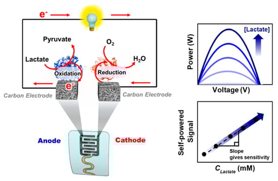 Advancements in biosensor technologies have resulted in a variety of personalized diagnostic and monitoring devices. However, almost all bioelectronics require energy sources to manipulate and signal the analytical result. In addition to harvesting energy applications, BFC-based devices also offer unique opportunities to act as self-powered biosensors (Figure 6). For example, as the glucose or lactate level increases (that is, the biofuel or bioanalyte level increases), a correlation to higher electrical power can be obtained. In other words, the electrical signals harvested from the biofuels themselves can indicate the concentration of the target analytes. The electrical power obtained from the BFC could sufficiently power electronics. For instance, a complementary metal-oxide-semiconductor (CMOS) wireless biosensing system tracking glucose and lactate concentrations, which consume ~1.2 μW of power, could be solely powered by BFCs []. In addition to directing the self-powered detection of metabolites, BFC-based devices have been applied for various other detection mechanisms [,].