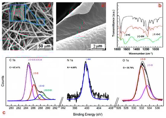 The covalent nature of these bonds was also confirmed by means of X-ray photoelectron spectroscopy (XPS). Figure 1c shows the typical peaks of the XPS spectrum and the elemental composition for the GO–PCL. XPS analysis obtained after nitrogen plasma activation showed diagnostic peaks of GO in the C 1s core level. In particular, the characteristic peaks related to the C=C and C=O bonds in GO (284.7 and 287.8 eV, respectively) can be distinguished in the C 1s core level. Furthermore, a remarkable peak at 399.2 eV in the N 1s core level region was observed, indicating the efficient derivatization of the patch with prim- or sec- amine groups. In agreement with FTIR data, this peak entails that the functionalization of the microfibers with GO involved the nucleophilic attack of reactive primary amine functions to the epoxy groups of the GO sheets.