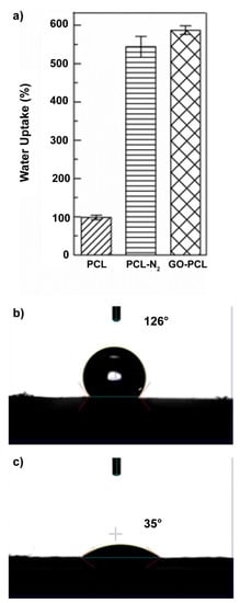 The water uptake observed in water for the plasma activated scaffold (PCL–N2) was 5.4 times higher than that of the virgin PCL patch (Figure 2a), while the water uptake observed for the GO–PCL patch was about six times higher, entailing a significant effect of the GO coating on water uptake, owing to its high water permeability [].