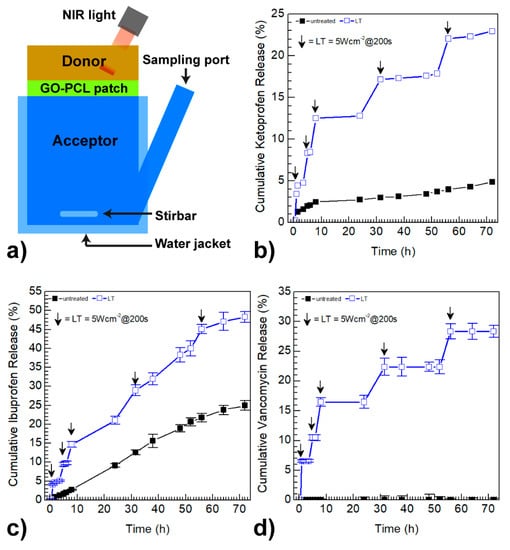 Schematization of a Franz cell used for drug release studies (a). Ketoprofen (b), ibuprofen (c) and vancomycin (d) release profiles of the drug loaded GO–PCL patches in PBS pH 7.4 after five cycles of near infrared (NIR) photo-stimulation: each arrow indicates the exposure to an 810 nm laser diode for 200 s and a power density of 5 Wcm−2.